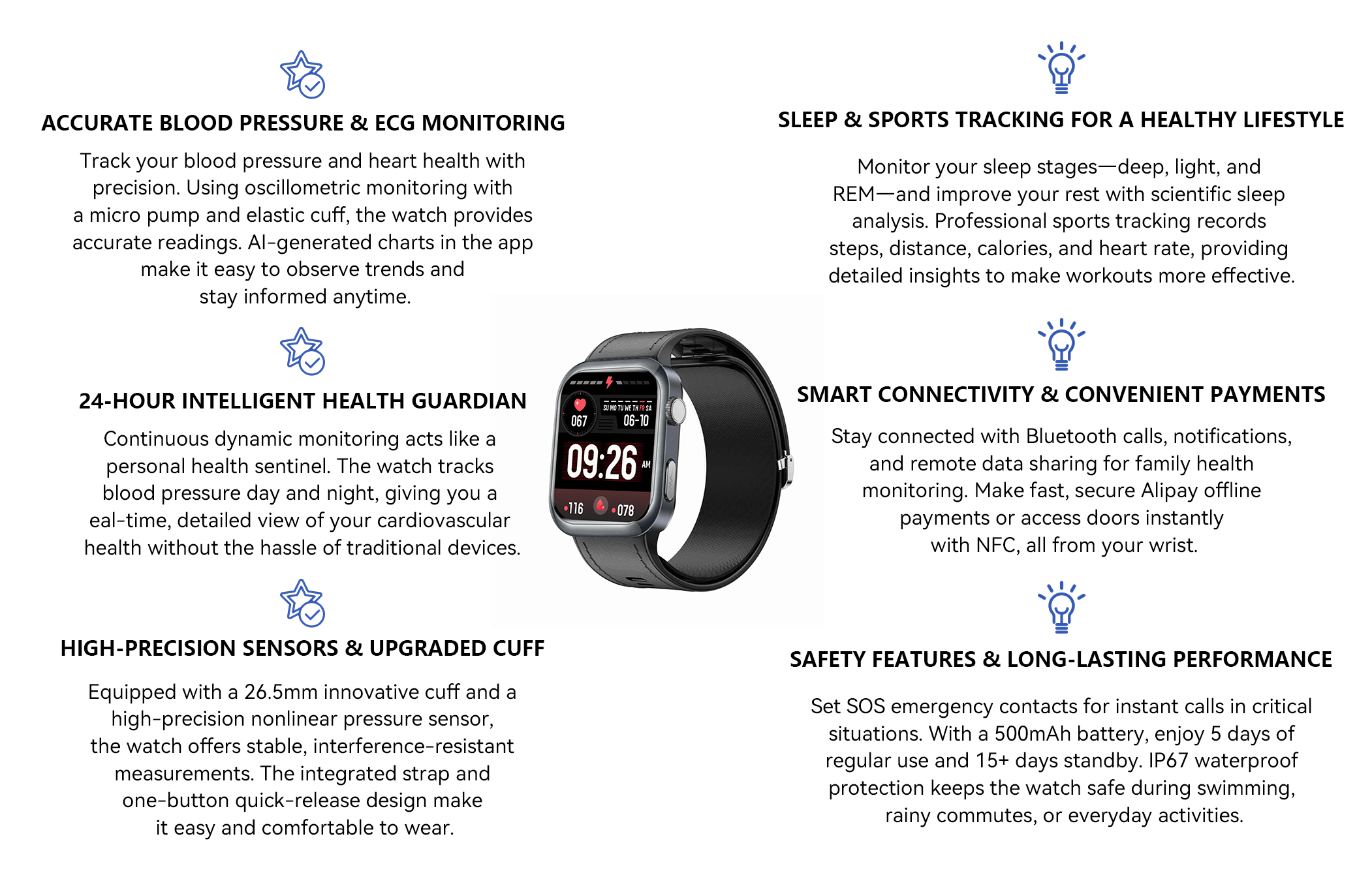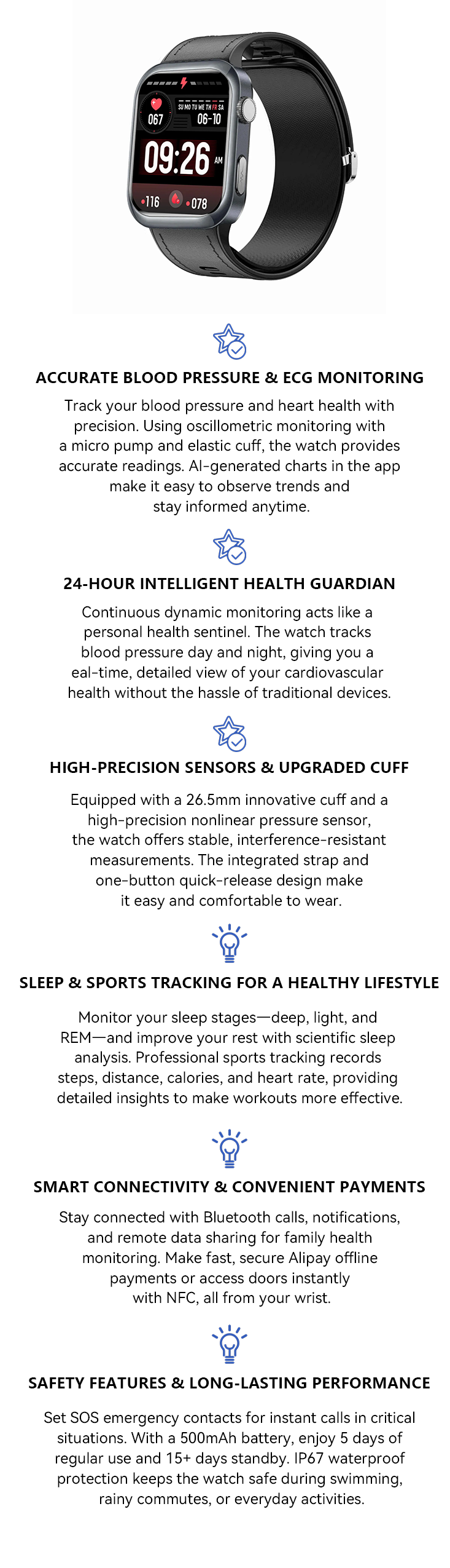 - Accurate BP & ECG – Tracks blood pressure and ECG with AI charts.